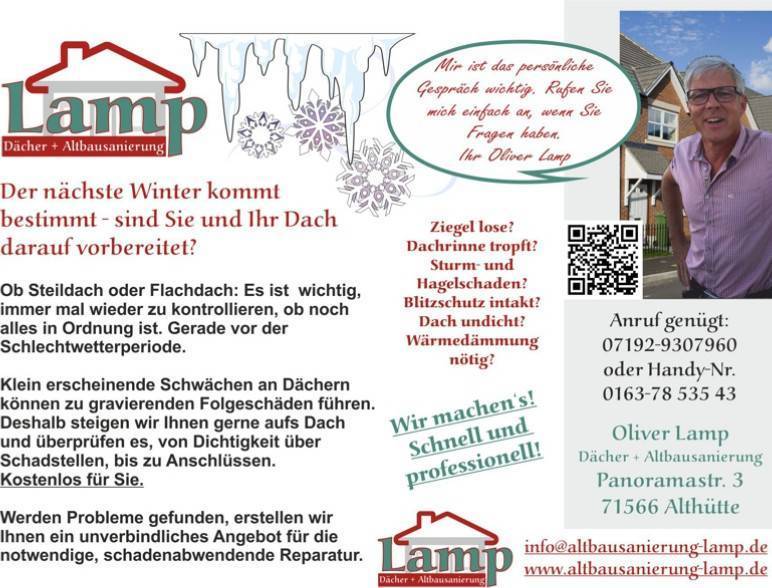 Die Firma ist in der Panoramastraße 3, 71566 Althütte ansässig und kann über das Telefon (071929307960) oder die Webseite (altbausanierung-lamp.de) erreicht werden.